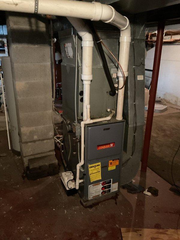 Completed installation of an upflow 96% efficient 70,000 BTU furnace, including installation of a metal condensate pump and Honeywell T6 Pro thermostat. All components were properly leveled and secured according to manufacturer specifications.