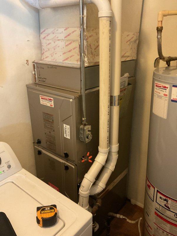 Conducted assessment of existing split system HVAC setup in residential utility room. Documented current installation which includes furnace with stacked air handler/AC component, associated PVC ventilation piping, and proximity to water heater. Provided comprehensive replacement estimate for complete split system upgrade based on evaluation of existing equipment configuration and space constraints.