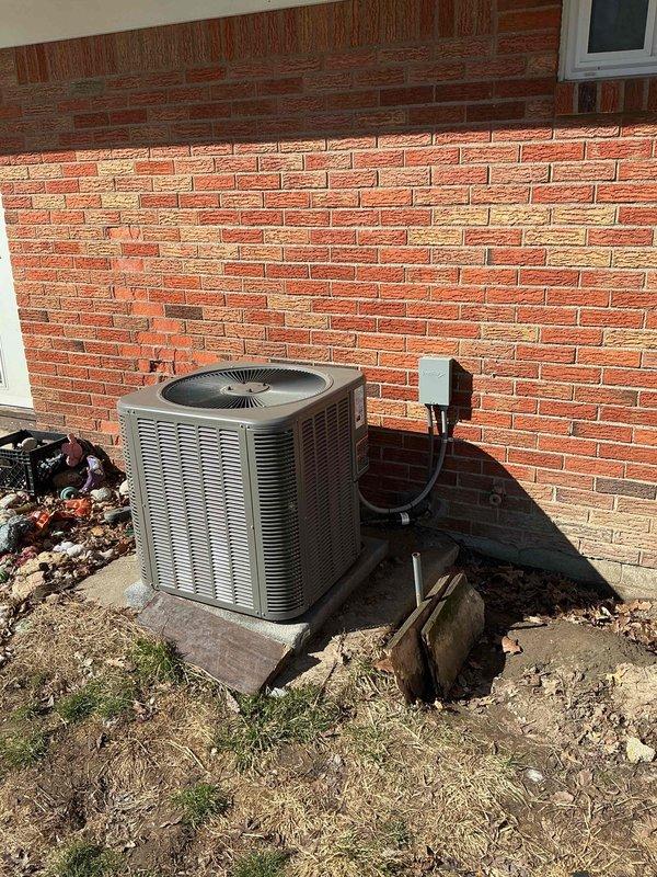 Completed an AC system start-up after installation. Unit was installed on a concrete pad against exterior brick wall with proper electrical connections via disconnect box. Visual inspection confirmed proper placement and connection of outdoor condenser unit, though noted minor unevenness in the concrete pad that may require future attention.