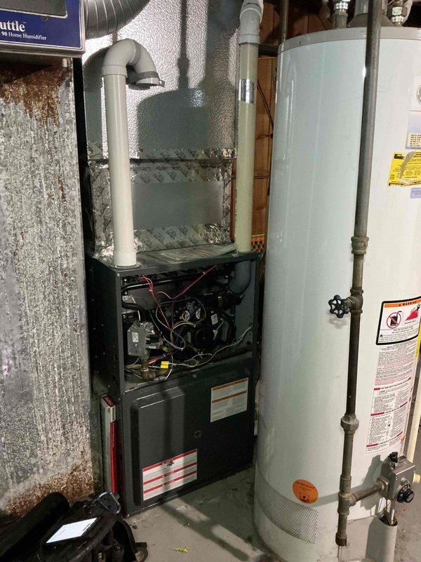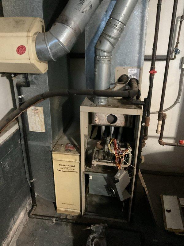 Completed comprehensive evaluation of existing residential HVAC system and prepared replacement estimate. Inspection of current furnace revealed aging unit with exposed internal components including control boards and wiring that would benefit from modernization. System assessment included examination of connected ductwork, ventilation pathways, and associated plumbing infrastructure to determine optimal replacement specifications.