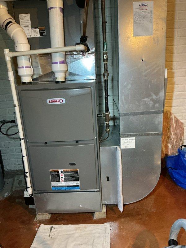 Successfully installed a Lennox 96% efficiency single stage 110kBtu upflow furnace with approximately 60 feet of 3" venting replacement. Installation required metal fabrication and spacer installation to properly fit the unit. Customer's existing Nest thermostat was reconnected and system was leveled and tested for proper operation.