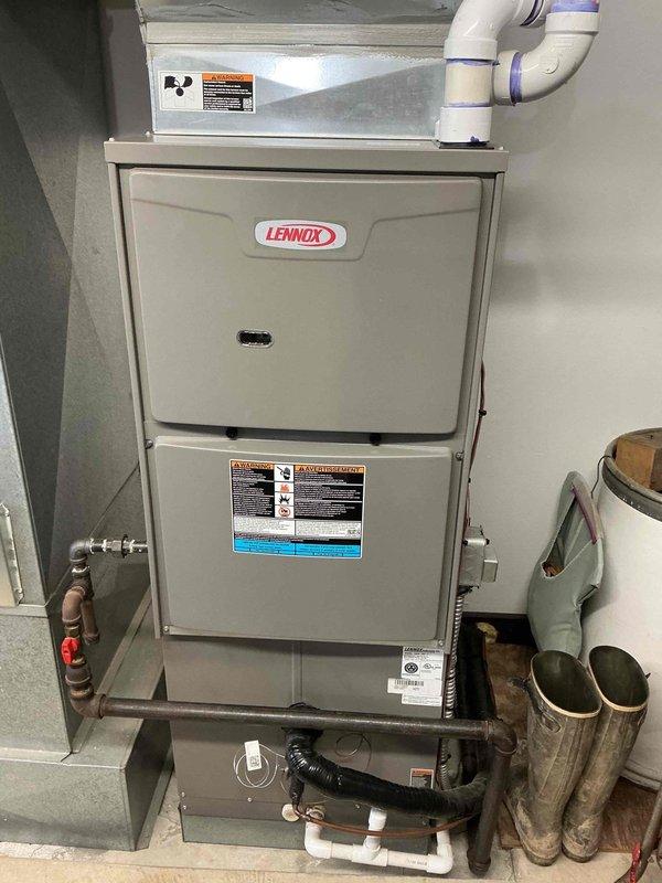 Performed routine maintenance on a 3-year-old Lennox gas furnace in basement location. Conducted manufacturer-recommended preventative maintenance protocol (MVP) including inspection of combustion system, heat exchanger, and venting. Unit appears properly installed with appropriate PVC venting and condensate drainage systems intact.