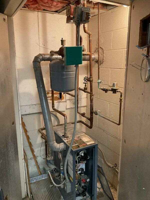 Conducted comprehensive boiler system assessment in residential mechanical room, documenting existing heating unit with connected copper piping network, expansion tank, and zone valve control system. Evaluation revealed aging but functional components with particular attention to the furnace housing, valve configurations, and integration with existing ductwork for potential replacement estimation.