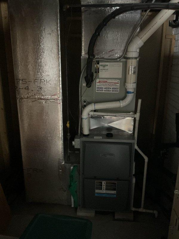 Conducted comprehensive assessment of existing HVAC system for equipment replacement estimate. Evaluated current forced-air furnace and air handler configuration, examined ductwork including vertical supply ducts and flexible connections with reflective insulation, and assessed PVC condensate drainage system. Inspected water heater operation and verified temperature settings to ensure proper functionality and safety compliance.