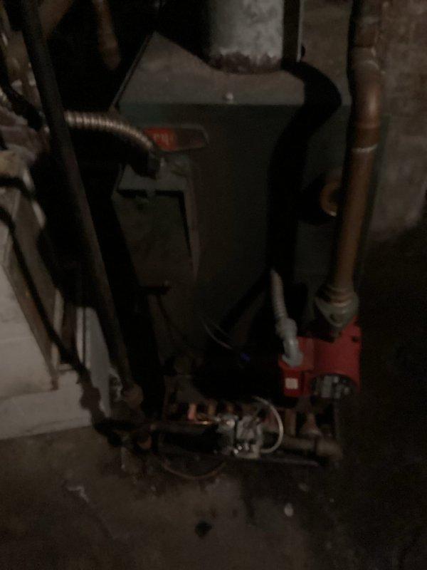 Responded to service call for furnace making loud noise. Performed diagnostic inspection on aging furnace system and identified significant corrosion at water heater connection point. Serviced furnace components to address noise issue and documented condition of HVAC system for future maintenance recommendations.