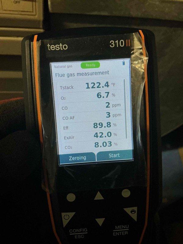 Performed standard furnace maintenance on natural gas system. Conducted combustion analysis with Testo analyzer showing optimal performance with 89.8% efficiency, acceptable CO levels (2-3 ppm), and proper oxygen/CO2 readings (6.7%/8.03%). System is operating safely within manufacturer specifications.