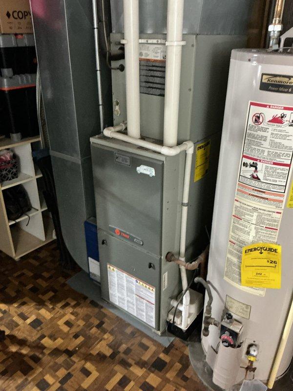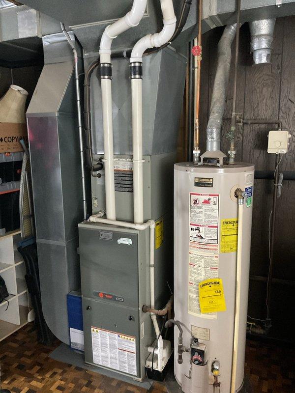 Conducted a free estimate for replacement of aging Trane furnace and water heater in customer's utility room. Documented existing setup including current furnace with PVC exhaust venting, cylindrical water heater with copper pipe connections, and surrounding ductwork configuration to provide appropriate replacement recommendations.