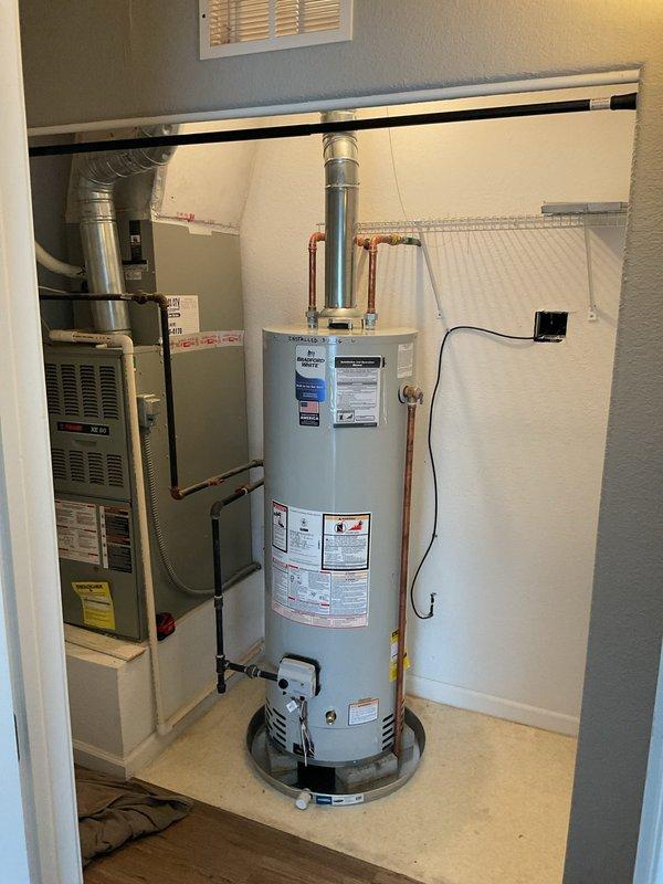 Successfully installed a 40-gallon standard gas tall water heater in utility room. Completed all necessary copper pipe connections for hot and cold water lines and properly secured metal vent pipe to existing ductwork. System was tested and confirmed to be in normal working condition with no leaks.