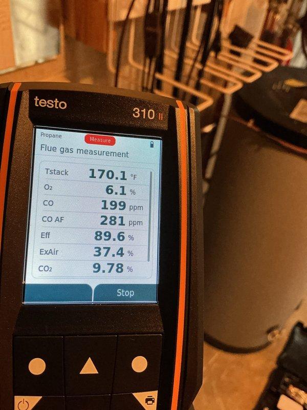 Performed diagnostic service on 2023 installed boiler under parts warranty. Conducted flue gas analysis using Testo 310 II, which revealed propane combustion efficiency at 89.6% with CO levels at 199 ppm (281 ppm air-free) and stack temperature of 170.1°F.